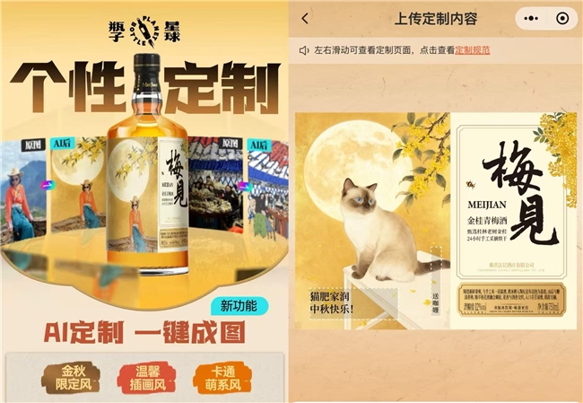 瓶子星球也與火山引擎展開合作,推出了“梅見”、“江小白”品牌的個性化AI定制酒。用戶可以上傳圖片DIY定制酒標,選擇多種生動精美的圖片風格,并附上祝福語,這種互動方式更加符合抖音上年輕消費群體的喜好。