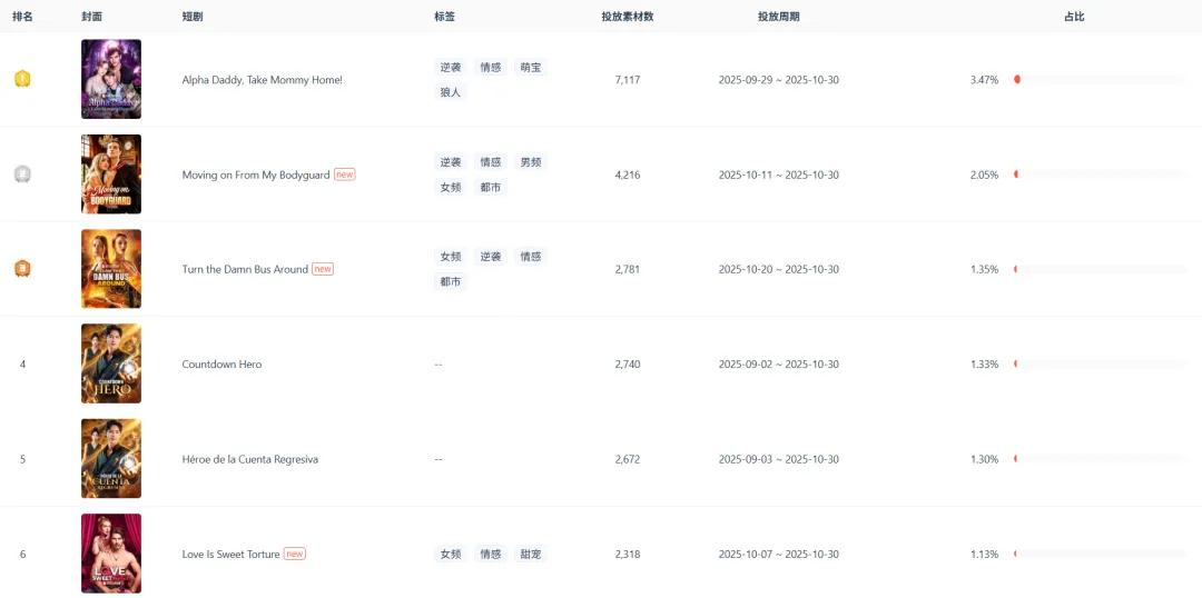 雖然DramaWave在全球收入排名第三,單月下載量突破400萬次,韓國市場甚至出現兩部充值破百萬美元的本土劇。但繁榮背后隱憂重重——ADX海外短劇版數據顯示,近30天投放的3576部短劇中,新劇占比56.7%,這種”以量取勝”的模式,也在考驗“短劇”的內容質量,以及用戶的持續付費情況。