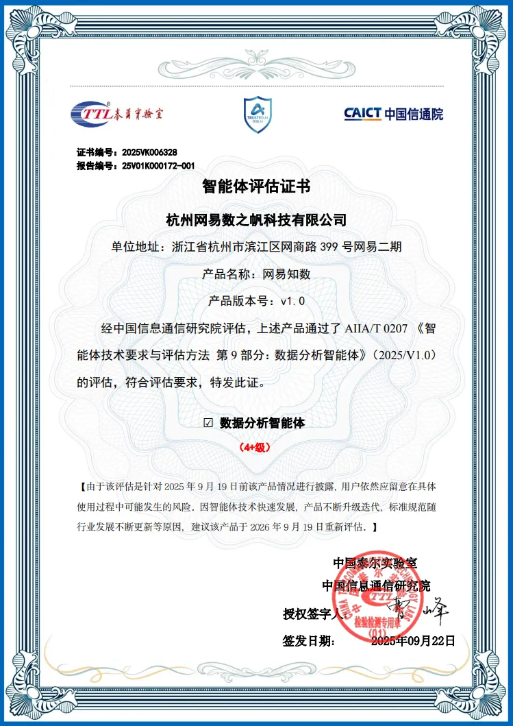 值得一提的是,網(wǎng)易知數(shù)是業(yè)界首批獲得當(dāng)前最高 4+ 評(píng)級(jí)的數(shù)據(jù)分析智能體,在行業(yè)內(nèi)處于無(wú)可置疑的領(lǐng)先地位。