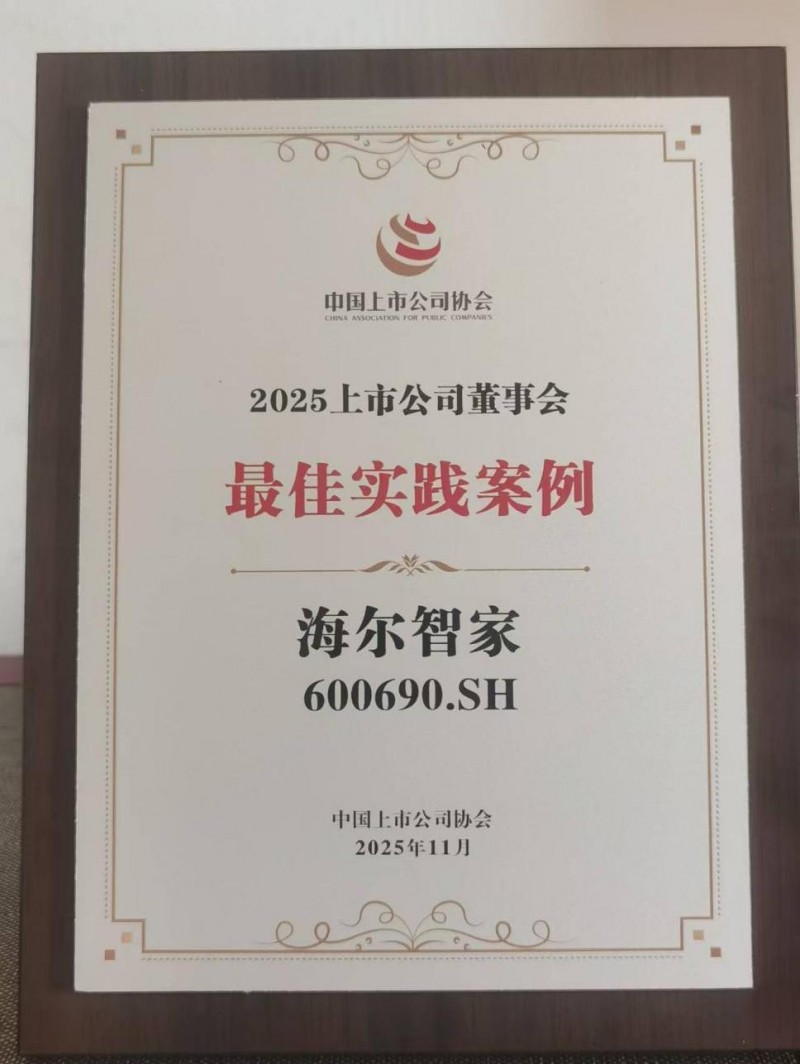 11月18日,中國上市公司協會第三屆理事會第六會議在北京召開,會上正式發布了“2025上市公司董事會最佳實踐創建活動”評選結果。其中,海爾智家榮獲“2025上市公司董事會最佳實踐獎”。