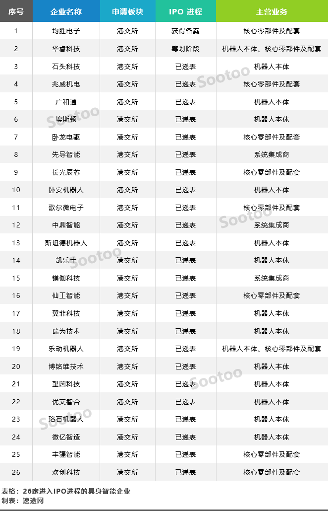 26家機器人產業鏈企業提交港股IPO(速途網制表)