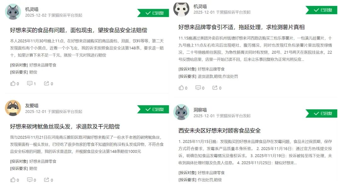 黑貓投訴平臺顯示,截至2025年12月2日,好想來品牌零食的累計投訴量為1102件,其中消費者反饋的食品安全問題五花八門:面包發(fā)現(xiàn)蟲子,碳烤魷魚絲發(fā)現(xiàn)頭發(fā),鳳爪變質(zhì),乳酸菌飲品出現(xiàn)發(fā)霉脹氣等等。